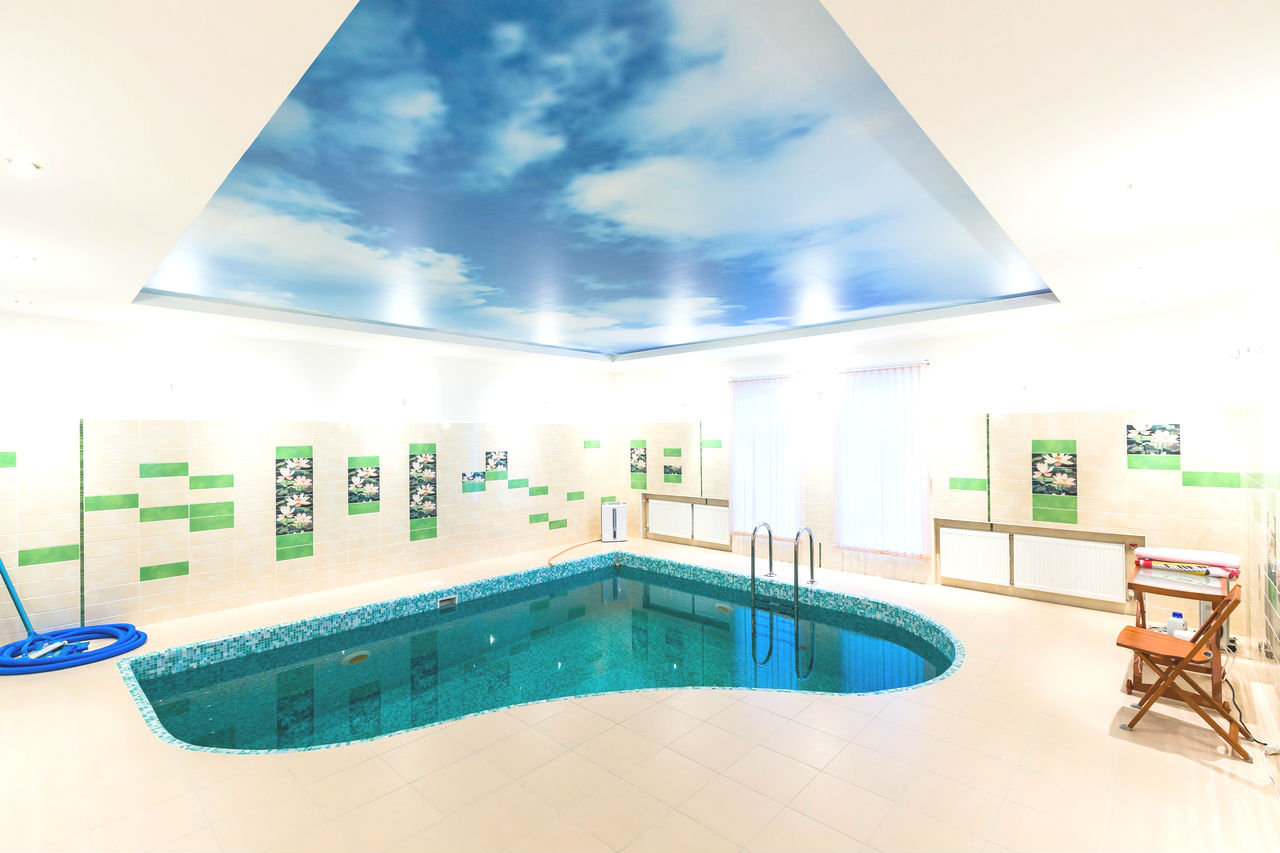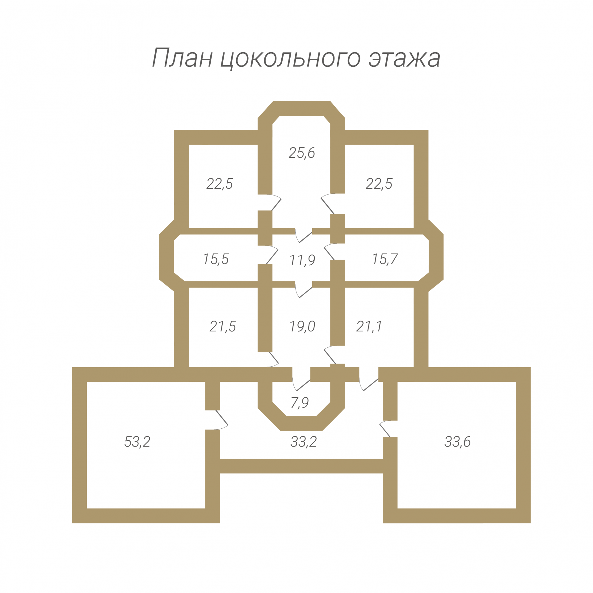 Перечисляем комнаты по часовой стрелке, начиная от левой нижней, площадью 20,2 м2. Это котельная дома. Рядом с ней расположилась гардеробная и кухня-столовая, площадью 38.1 м2. На правой стороне, сверху вниз — кабинет и два санузла. В правой нижней части схемы — бассейн, площадью 46,9 м2.